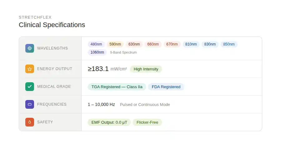 At StretchFLEX, we don’t just move your limbs; we optimize your architecture. Our clinic utilizes Class IIa Medical Grade (ARTG/TGA Registered) technology. We “stack” your stretching session with high-intensity, multi-spectral light to trigger cellular-level repair.